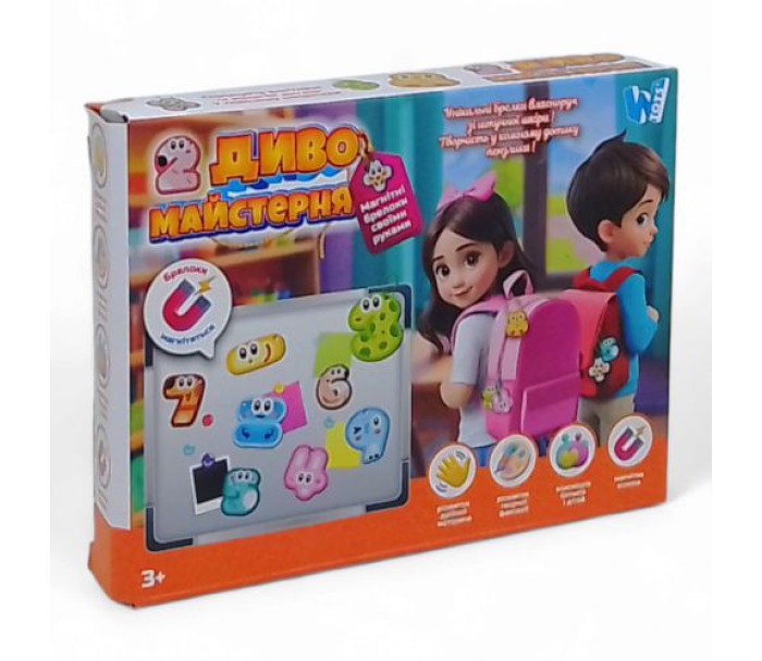 Комплектація: 2 кольорів фарб, 2 пензлики, палітра, 12 магнітних стікерів, 5 ланцюжків, 8 шнурків