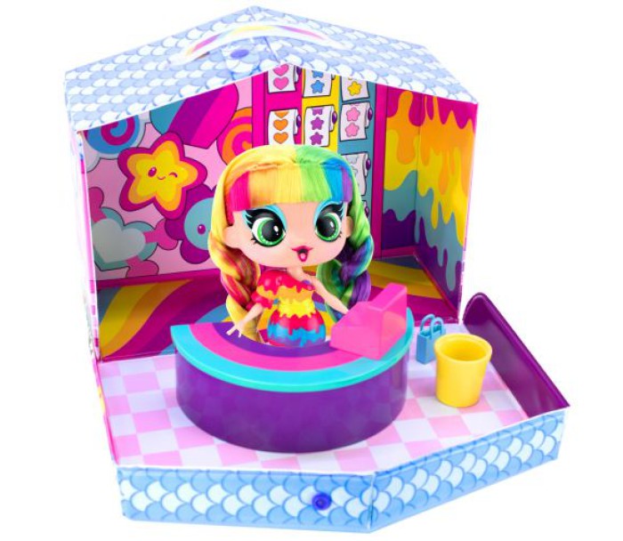 - Створюйте фантастичні зачіски з мʼякого різнокольорового волосся ляльки та додайте стікери, щоб прикрасити та укласти зачіску в стилі Decora.