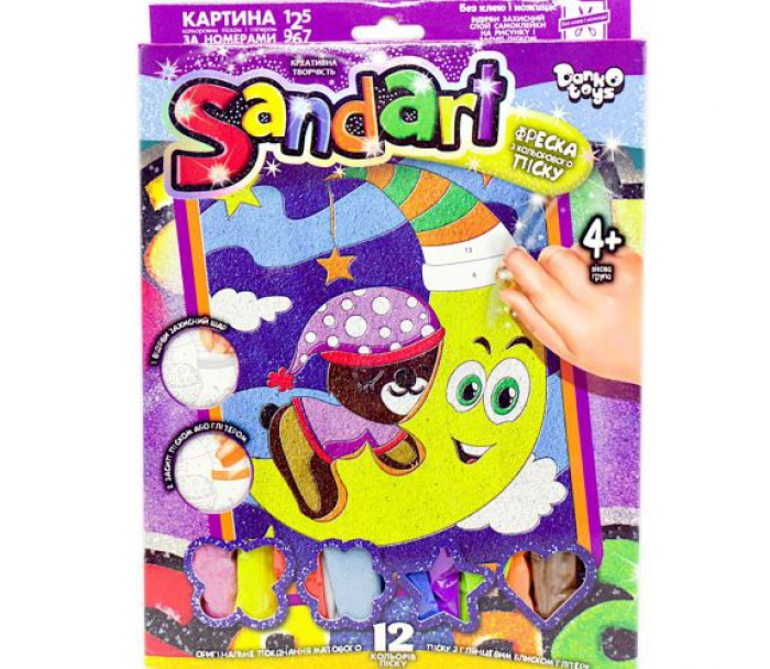 набір, для, творчості, sandart, фреска, кольорового, піску, розвиває, креативне, мислення, творчі, здібності, художній, смак, без, ножиць, клею, інструкція, відокремте, ділянок, позначених, одним, певним, номером, висічену, захисну, плівку, засипте, відкриту, липку, поверхню, пісок, обраного, кольору, прикрасити, картину, Dankotoys, SA-02-01U02U03U10U, SA-02-01U, 02U, 03U...10U
