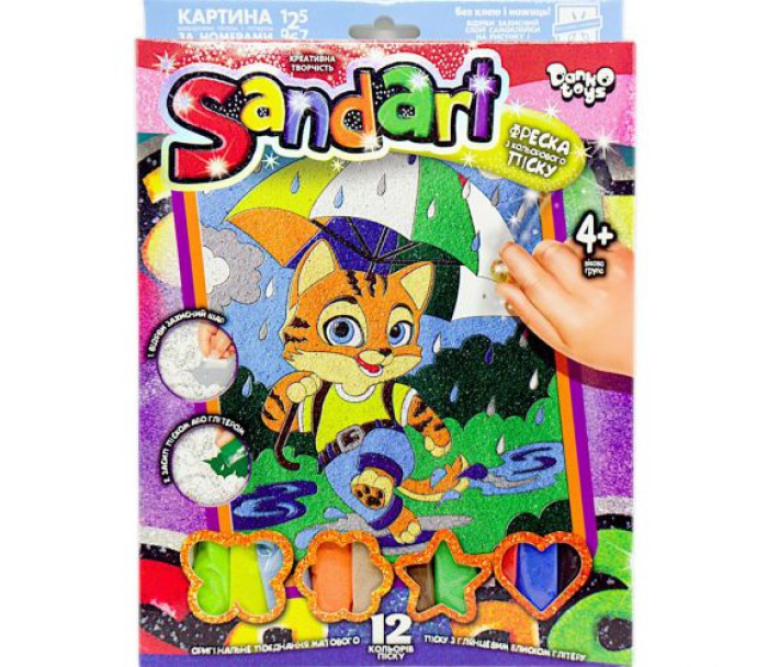 набір, для, творчості, sandart, фреска, кольорового, піску, розвиває, креативне, мислення, творчі, здібності, художній, смак, без, ножиць, клею, інструкція, відокремте, ділянок, позначених, одним, певним, номером, висічену, захисну, плівку, засипте, відкриту, липку, поверхню, пісок, обраного, кольору, прикрасити, картину, Dankotoys, SA-02-01U, 02U, 03U...10U