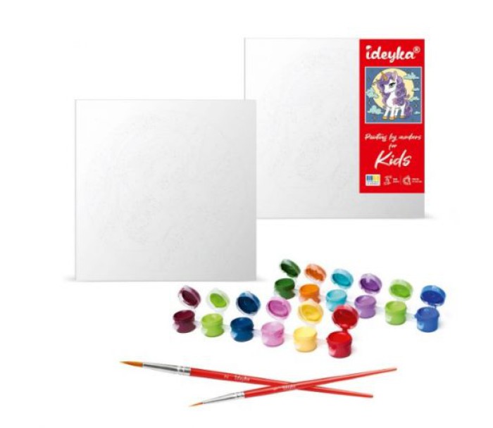 Комплектація: полотно на підрамнику з галерейною натяжкою, паперовий дублікат з контурним малюнком картини (на картині нанесена схема контурів зображення з нумерацією), художні нейлонові пензлі, палітра акрилових фарб у контейнерах