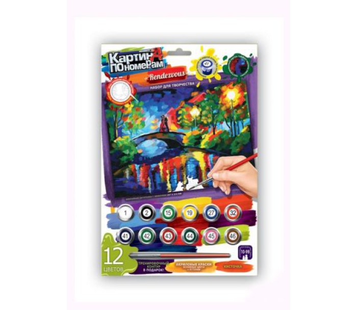 Картина за номерами (297х210 мм). У наборі: 12 акрилових фарб (основні кольори + відтінки), пензлик, контурна заготовка 2 шт., Інструкція.