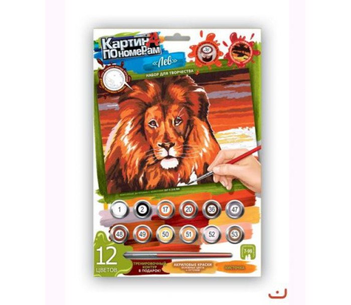 Картина за номерами (297х210 мм). У наборі: 12 акрилових фарб (основні кольори + відтінки), пензлик, контурна заготовка 2 шт., Інструкція.