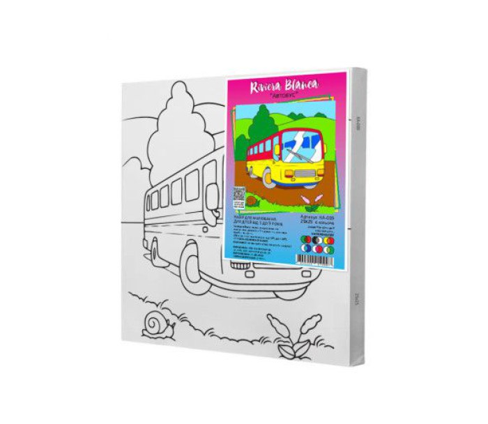 Комплектація: синтетичне полотно з нанесеними контурами майбутнього малюнка, натягнуте на дерев'яну рамку; водорозчинні акрилові фарби; пензлик