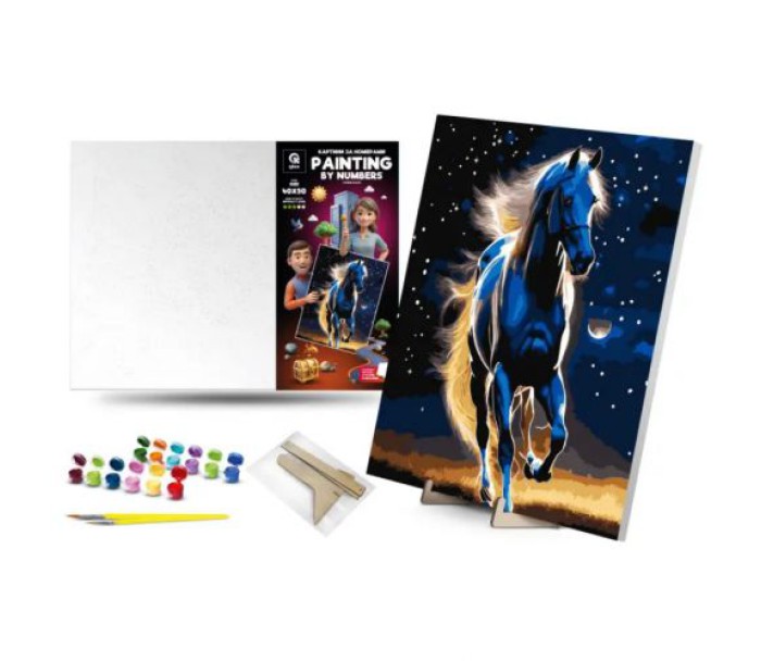 Комплектація: полотно на підрамнику з галерейною натяжкою, художні нейлонові пензлі, палітра акрилових фарб у контейнерах, дерев'яні деталі підставки для картини.