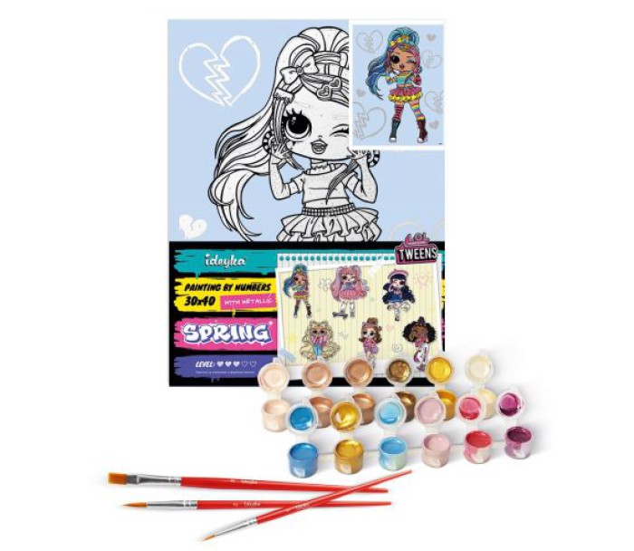 L.O.L. Surprise! O.M.G. Tweens - це енергія, креативність і експерименти з модою. Картини серії Tweens - вибух кольору та деталей, що передають харизму ляльок: модний одяг, трендові аксесуари, стильні образи. Набір для творчості з красивим сюжетом на полотні і всім необхідним для створення готової картини включає: натуральне полотно на підрамнику із галерейною натяжкою; 3 нейлонові художні пензлики; соковита палітра пронумерованих, акрилових фарб в контейнерах. На полотні нанесена схема контурів зображення з нумерацією. Окремі сегменти додатково пофарбовані в тон кольорів, якими необхідно зафарбовувати полотно. У наборі металізовані акрилові фарби та звичайні акрилові фарби.