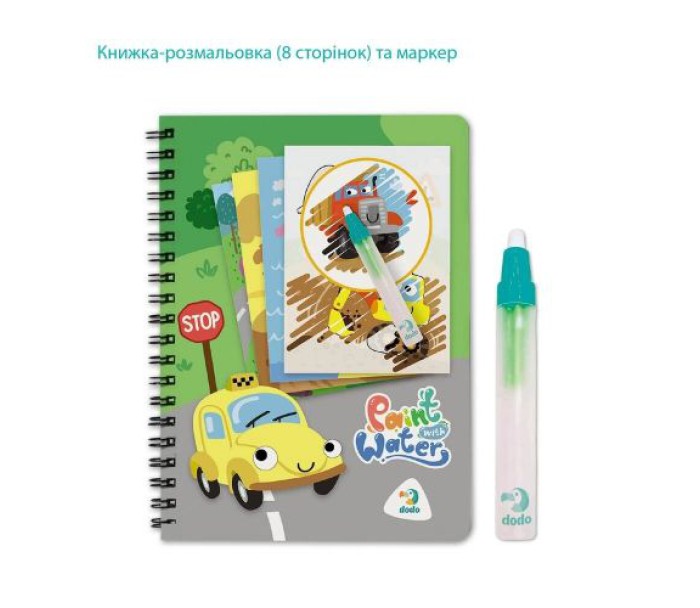 Водні розмальовки у формі блокнота на 8 сторінок. Щоб картинка проявилася, потрібно набрати воду в маркер, який є в наборі, та розфарбувати листок. На кожній картинці є приховані елементи, які дитина має знайти, проявивши малюнок. Кольори на картинці зникають, коли вода висихає, тому розмальовки можна використовувати по кілька разів. Виконано з якісних та безпечних матеріалів.