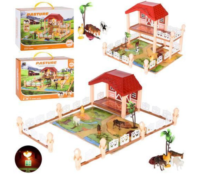 Іграшкова ферма. В набір входять пластикові та картонні деталі для будинку та огорожі, пластикові тварини, фермер та пальми та лампа що світиться. Сподобається творчим дітям, котрі люблять щось будувати, складати. Набір виглядає дуже яскраво і виготовлений з якісних матеріалів.