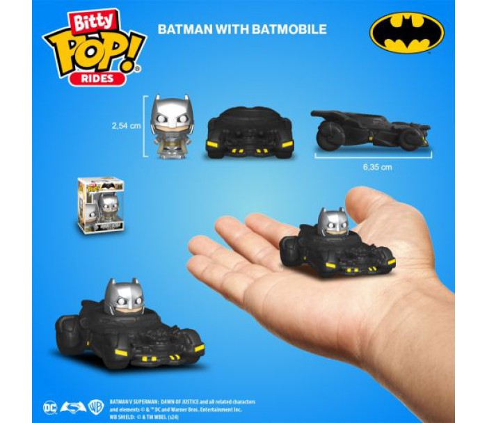 Набір фігурок BITTY POP! Ride - БЕТМЕН І БЕТМОБІЛЬ стане чудовим подарунком для прихильників фільму «Бетмен». Супергерой Бетмен - людина-кажан з популярних американських коміксів, випущених компанією DC Comics.