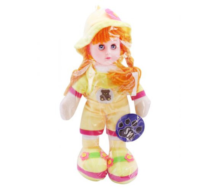 Лялька мʼяка, музична, 30 см. Розповідає віршик, російською мовою. Відкриває і закриває очі. У шапочці.