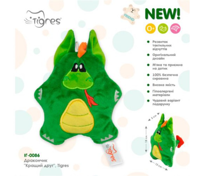 Дракончик "Кращий друг" від бренду Tigres - м’яка та ніжна, бездоганна для малюків з народження. Животик, що шарудить, приверне увагу малюка й розвиватиме тактильні відчуття, а спеціальні гранули, що використовуються при наповненні іграшки, розвиватимуть дрібну моторику руку, яка відповідає за мовлення дитини. Безпечні матеріали, якісна вишивка, яскраві кольори та оригінальний дизайн – «Кращий друг» сподобається і малюкам, і дошкільнятам, і школярам. "Кращий друг" заспокоїть малечу в дитячому садку та допоможе адаптуватися в школі.