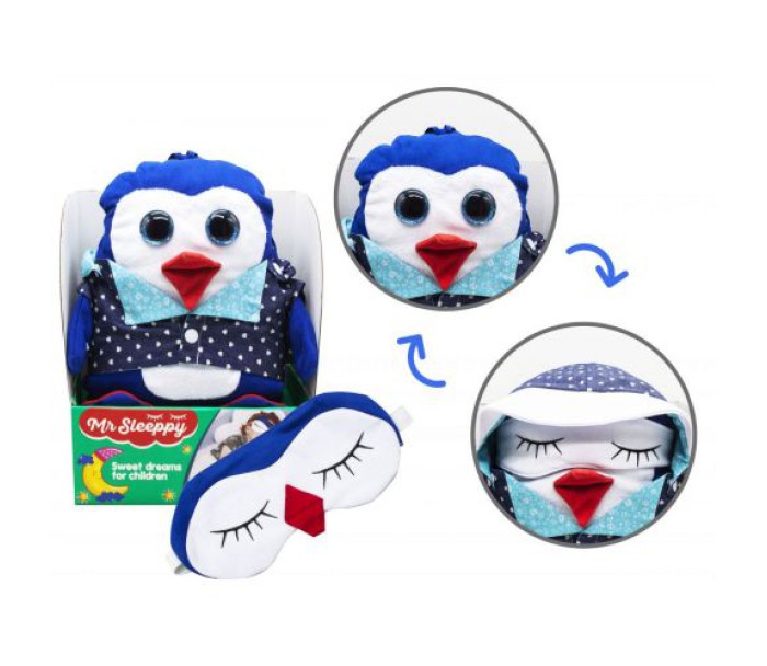 Іграшка-сплюшка "Пінгвін". Мила плюшева тваринка в смішному костюмі порадує вашого малюка. Іграшка приємна на дотик. З великими, яскравими очима, а під час сну, на іграшку можна одягати маску для сну (пришита до іграшки, її можна піднімати або опускати на очі). У наборі з сплюшей є маска для сну із зображенням мордочки тварини. Виконана з якісних і безпечних матеріалів.