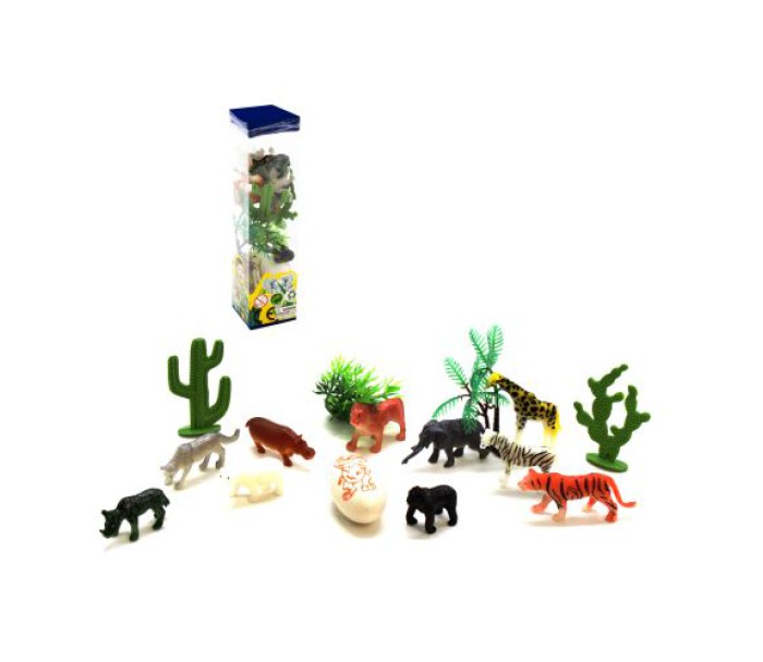 Набір складається з 12 пластикових фігурок в колбі з кришечкою у вигляді тварини. У колбі по 10 тварин, 4 дерева і яйце динозавра. Приблизний розмір фігурки - 3-6 см.