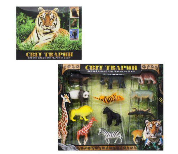 Набір познайомить дитину з приголомшливим світом диких тварин. У комплекті 12 фігурок представників фауни планети Земля: бегемот, слон, ведмідь, панда, тигр, носоріг, лев, горила, крокодил, жираф, зебра і антилопа. Розмір фігурки - 5-7 см. Виконані із щільної гуми.