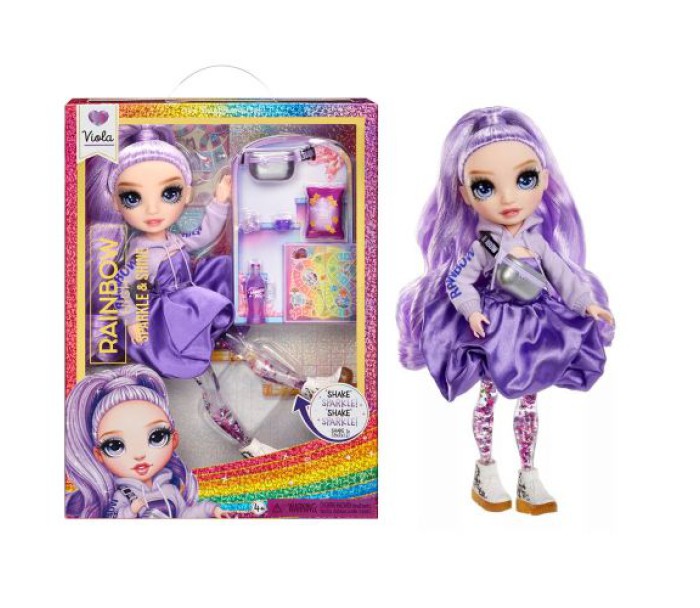 Лялька RAINBOW HIGH серії 'Sparkle & Shine' - ВІОЛА - стильна красуня з волоссям і одягом яскравого бузкового кольору. У Віоли є яскрава відмінна риса - її прозорі ніжки наповнені чарівними блискітками! Ви можете струшувати їх, як снігову кулю та насолоджуватися сяйвом!