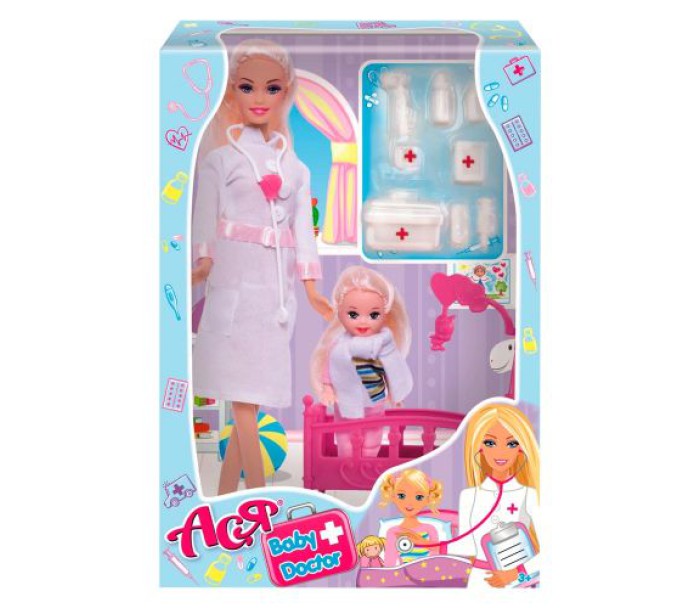 Красива лялька в білому лікарському халаті. Рухливі руки, ноги та голова. Також в комплекті є різні медичні інструменти та аксесуари, дитяче ліжечко та лялечка-пацієнт (10 см; рухомі ручки, ніжки та голова). Розмір ляльки-лікаря: 29 см.