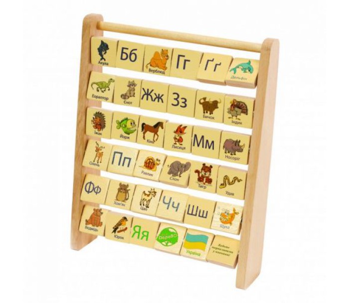 Дерев'яна абетка у вигляді стійки з шістьма рядами букв, що перевертаються. На звороті кожного квадратика з літерою є малюнок, що відповідає цій літері. Висота стійки - 28 см. Виконано з якісних та екологічних матеріалів.