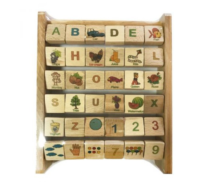 Дерев'яна абетка у вигляді стійки з шістьма рядами букв, що перевертаються. На звороті кожного квадратика з літерою є малюнок, що відповідає цій літері. Висота стійки - 28 см. Виконано з якісних та екологічних матеріалів.