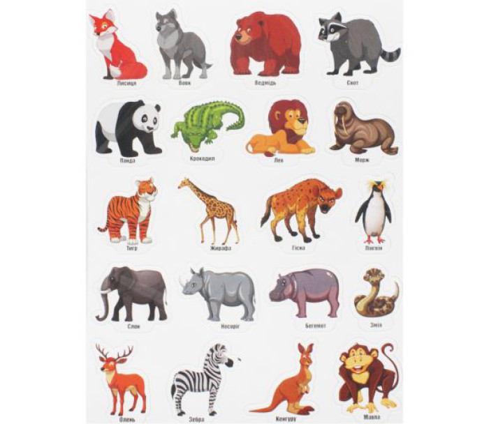 Набір з 20-ти магнітів з дикими тваринами на аркуші розміром 30х47 см. Кожне звірятко підписано українською мовою. Граючи з такими магнітами дитина зможе весело та легко вивчити світ дикої природи. Виконані з якісного та безпечного матеріалу. Для дітей віком від 3-х років.