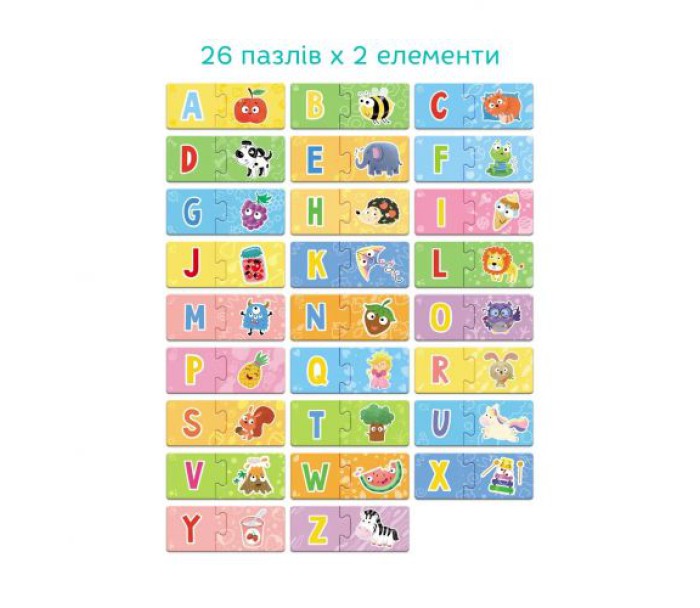 Набір із 26-ти пазлів, кожен з яких складається із 2-х елементів. Дитині потрібно поєднати літери з відповідними малюнками предметів та тварин. 26 пар яскравих палів, які входять до складу гри, допоможуть дитині з легкістю та цікавістю вивчити абетку. Гра для дітей 3-5 років.