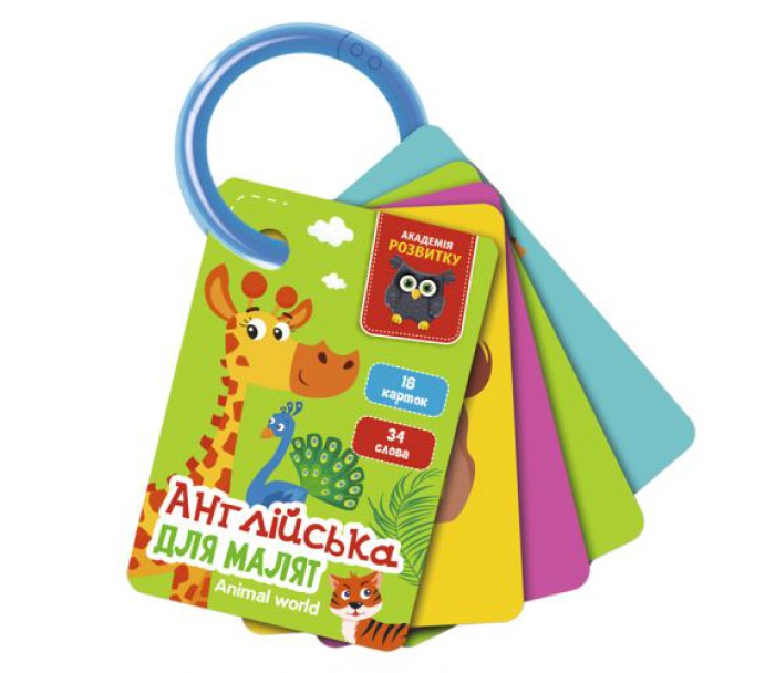 Вивчайте разом із малюком англійські слова та розглядайте яскраві ілюстрації до них. Виконуйте разом цікаві завдання. Набір складається з 18 двосторонніх карток на пластиковому кільці, яке можна прикріпити до ліжечка або коляски, або просто тримати в руці.