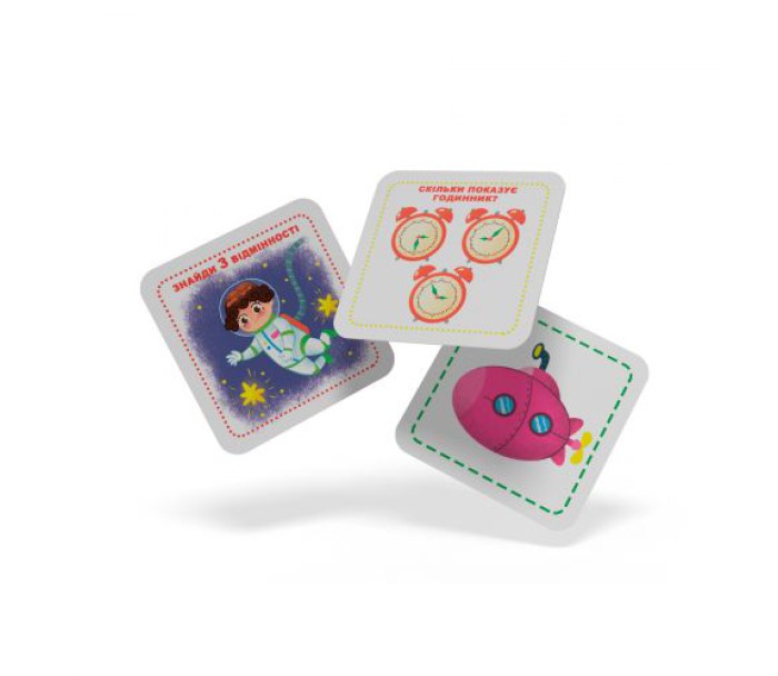 Набір "Розумні картки" складається з 30 карток і 5 типів завдань, що відрізняються за складністю. Цей навчально-ігровий комплект призначено для розвитку в дитини логічного мислення, мови й мовлення, розширення словникового запасу, тренування памʼяті та здатності концентрувати увагу. Він стане в пригоді під час підготовки до школи. На картках є завдання на пошук подібностей та відмінностей між малюнками, складання картинки зі шматочків, упізнавання предметів за тінню, розподіл обʼєктів за смисловими групами, пошук недостатнього елемента та багато іншого.