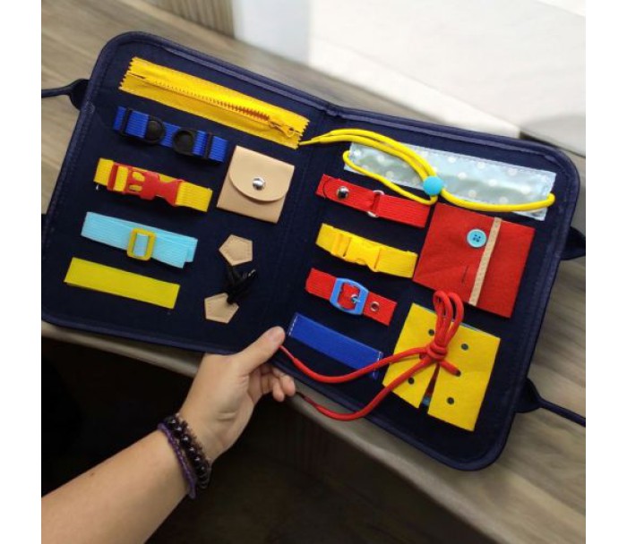 Навчальна бізісумка з фетру "Застібки" — це розвиваюча іграшка, що сприяє розвитку дрібної моторики та координації рухів у дітей. Усередині сумки розташовані різноманітні застібки: блискавка, гудзики, кнопки, ремінець, липучки, фастакс. Кожен елемент надає можливість дитині тренуватися в застібанні та розстібанні, що допомагає розвивати логіку та самостійність.