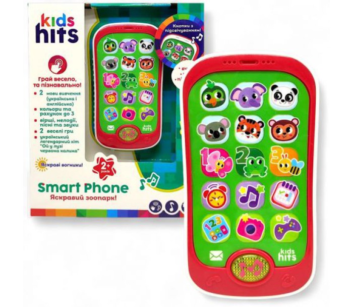 Телефон музичний "SmartPhone Яскравий зоопарк" - це яскрава і цікава іграшка, що розвиває. У телефону зібрано безліч корисних функцій: вивчення цифр, назви та звуки тварин, українські мелодії та дві гри. Має дві мови вивчення - українська й англійська, що прискорює вивчення цих мов. Яскраве