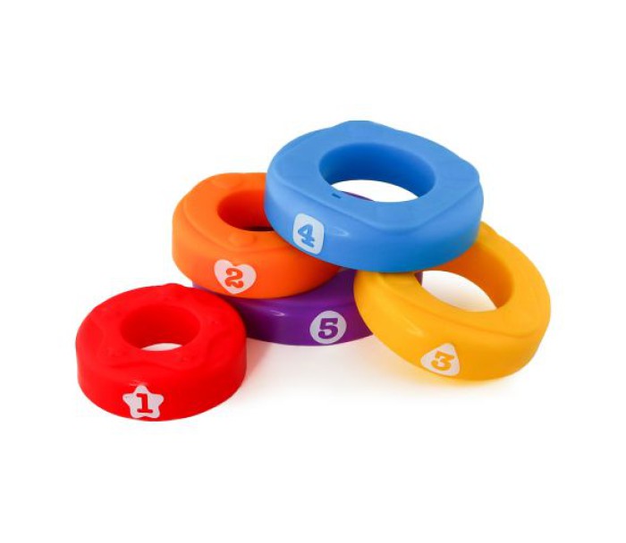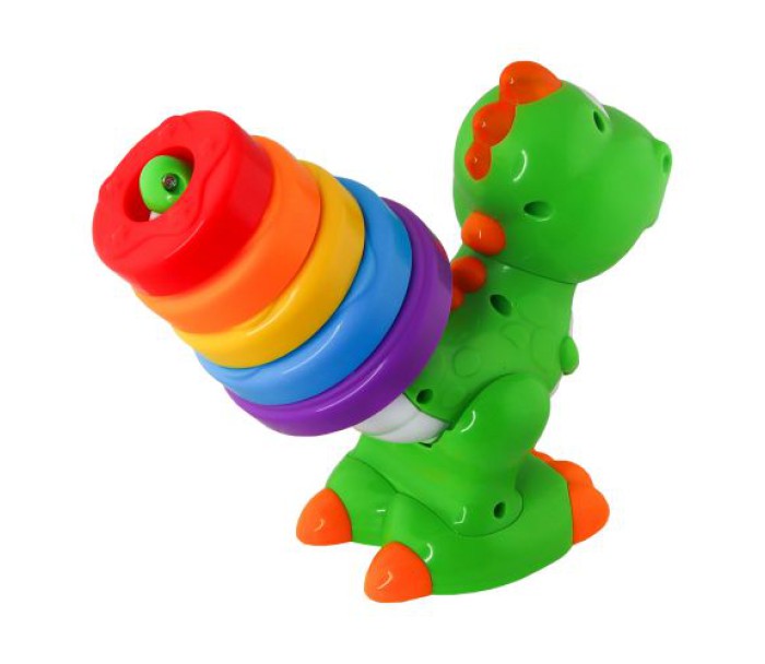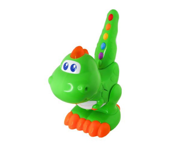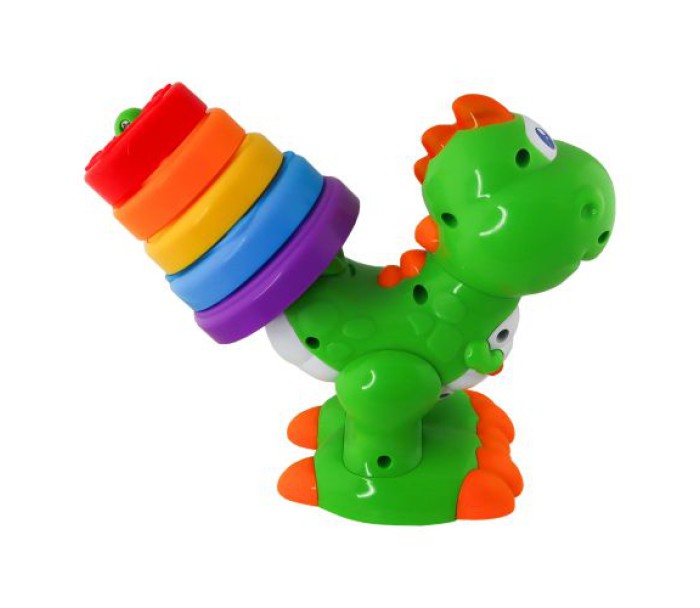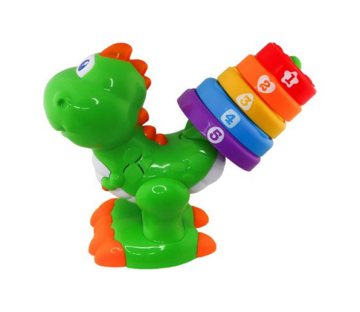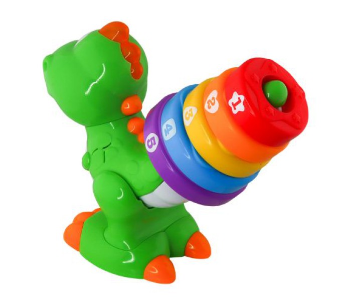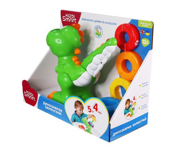Двомовна іграшка у вигляді барвистого динозаврика. Є два режими: гра українською мовою та гра англійською мовами. Щоб розпочати гру, переведіть перемикач у потрібне положення: "Українська" або "English". Натисніть на миготливий гребінець - і динозаврик радісно привітається.Продовжуйте натискати, щоб почути веселі фрази та пісеньку. Опускайте кільця на хвостик, щоб динозаврик промовляв числа або кольори. Нахиліть голову динозавра донизу та відпустіть — усі кільця зістрибнуть у супроводі кумедних звуків. Кольорові кільця різного розміру можна також складати у пірамідку. Розмір динозаврика: 19х9,5х17 см. Рекомендовано для діток старше 12 місяців.