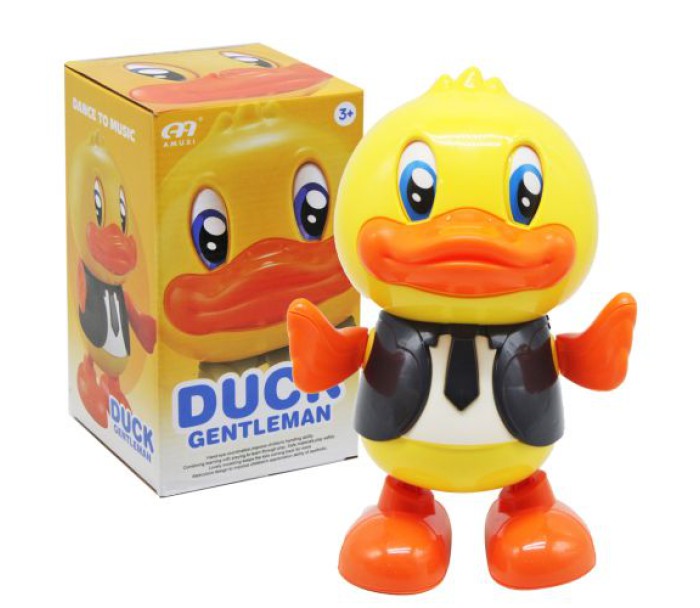 Яскрава музична іграшка у вигляді каченя, що виконує динамічний танець у такт веселої музики. Іграшка виконана в яскравому, цікавому дизайні. При включенні, лапки починають світитися різними кольорами, а очі рухаються у різні сторони. Розмір іграшки: 20х13х8 см. Виконаний з якісних та міцних матеріалів. Працює від 3-х батарейок АА.