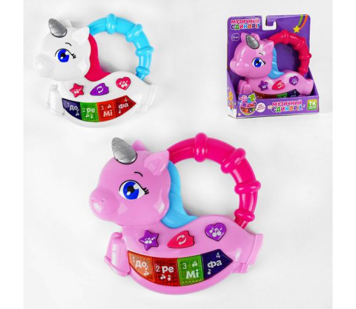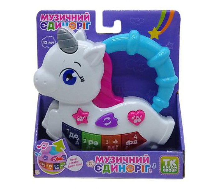 Цікава інтерактивна іграшка для малюків. Виконана у вигляді єдинорога з клавішами і кнопками. Має зручну ручку.