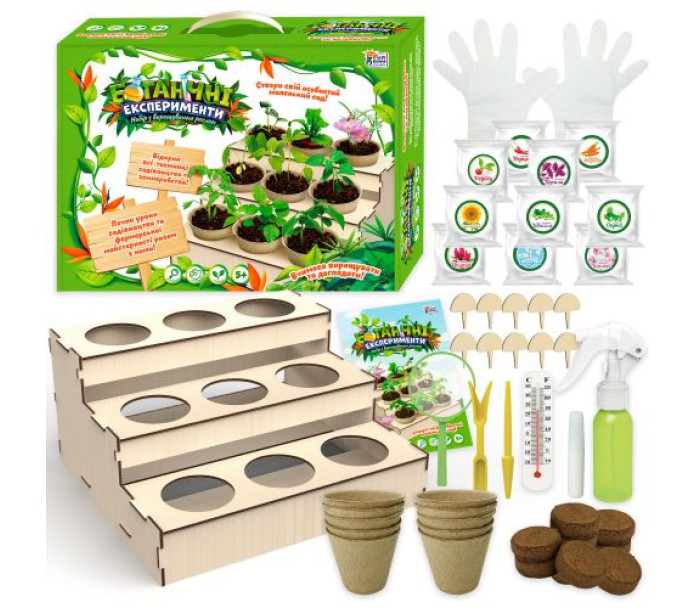 Цей набір створений спеціально для спостереження за появою пагонів рослин та їх розвитком. В комплект входить: 10 садових табличок, 5 брикетів ґрунту для вирощування, 10 біорозкладних чаш для розсади, піднос, 1 пара рукавичок, 2 інструменти для догляду за рослинами, пульверизатор, клей, термометр, збільшувальне скло, 10 пакетиків насіння різних рослин та докладна інструкція .