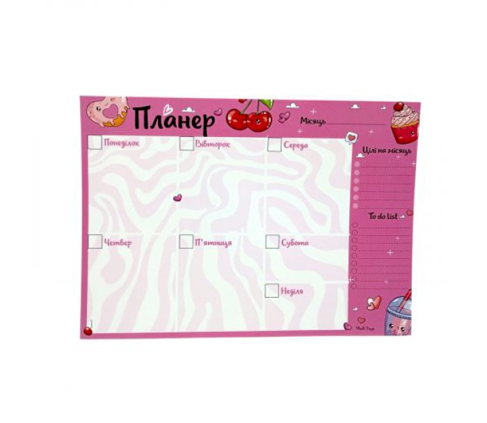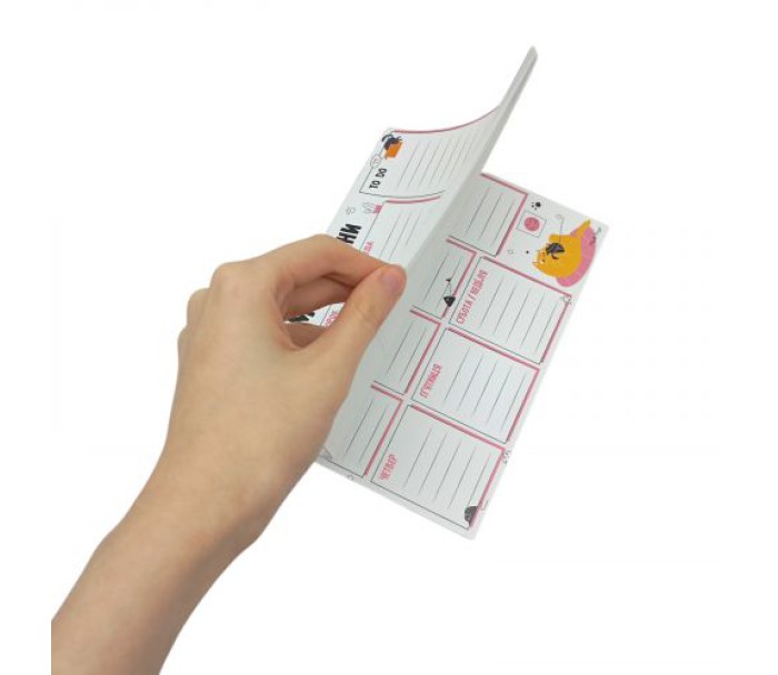 Зручний планер на тиждень для дітей та дорослих. Завдяки продуманому дизайну можна розписувати плани не тільки на тиждень, а й додати додаткові цілі чи важливу задачу в окреме поле де її буде найкраще помітно! В комплекті присутньо 54 аркуші — тож планера вистачить аж на 378 днів! Розмір одного листа 20 х 14,5 см.