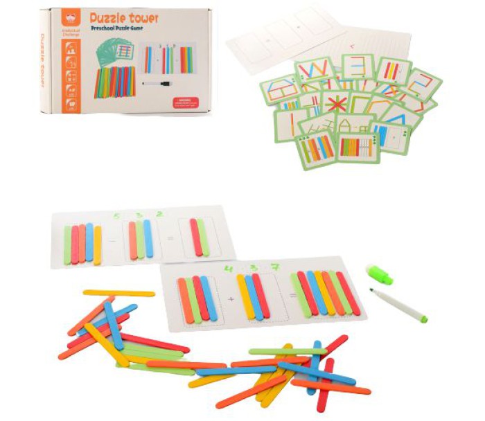 Комплектація: Рахункові палички, 25 карток із завданнями, маркер, 2 картки для прикладів