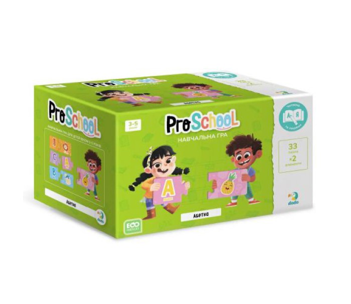 Набір із 33-х пазлів, кожен з яких складається із 2-х елементів. Дитині потрібно поєднати літери з відповідними малюнками предметів та тварин. 33 пари яскравих пазлів, які входять до складу гри, допоможуть дитині з легкістю та цікавістю вивчити абетку. Гра для дітей 3-5 років.