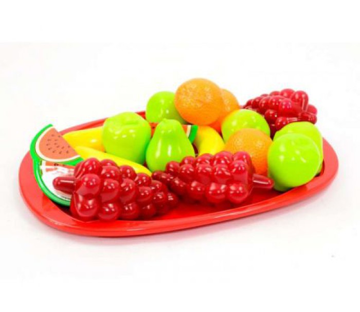 Набір з 15-ти яскравих пластикових фруктів: 3 банана, 2 винограду, 2 ківі, 2 мандарина, 3 груші і 3 яблука. Також в комплекті є піднос (32 х 22 см).