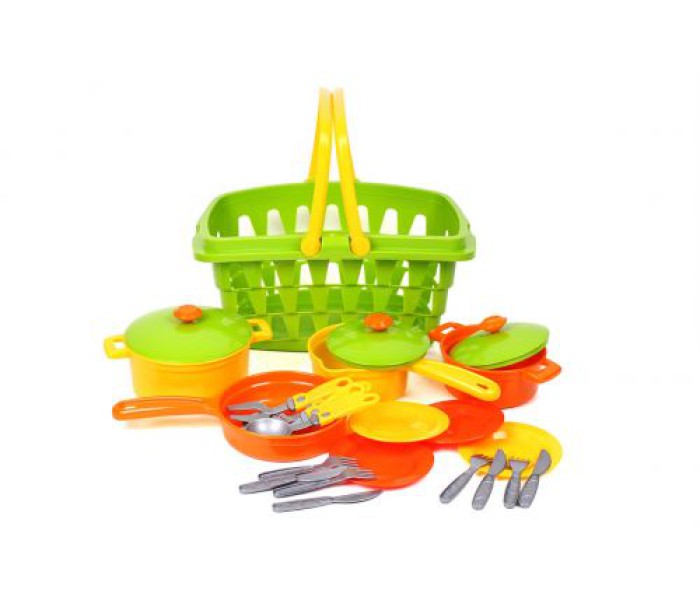 Яскравий пластиковий набір складається з кошика з ручками, 2х каструльок кришечками, каструльки з ручкою і кришкою, сковорідки, 4х тарілок, 4х вилок і ножів, 4х приладів для готування.