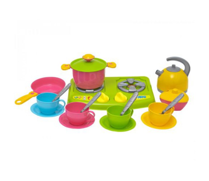 Пластиковий набір посуду з 20 предметів. У комплекті: плита з 2-ма конфорками (24 х 17,5 см), сковорідка, чайничок, каструлька з кришкою, 4 чашечки, 4 блюдця, 4 чайних ложки, цукорниця з кришкою.