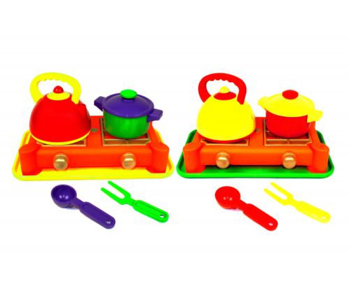 Газова плита (6 предметів: піднос, плита, чайник, каструля, ложка, виделка.). Матеріал: пластик.