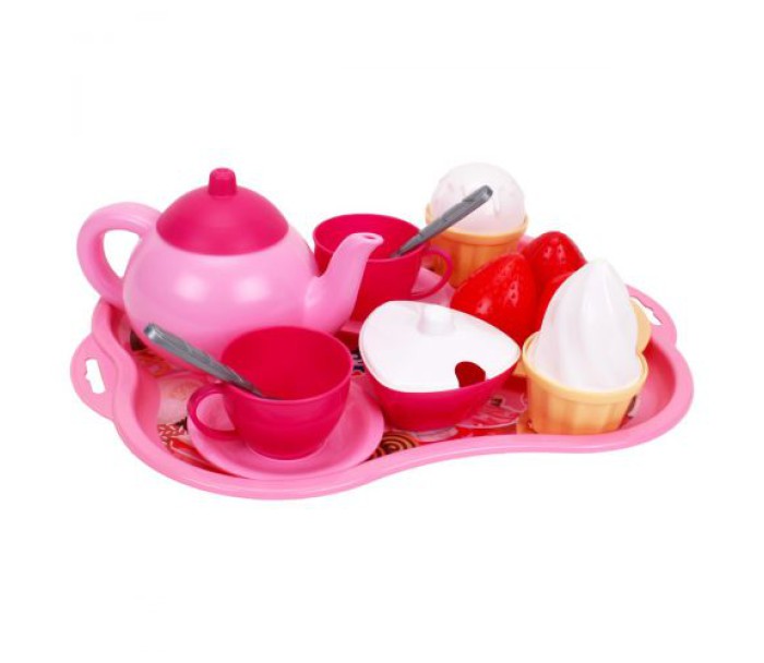 Ігровий набір пластикового посуду буде хорощие подарунком дитині. У комплекті є: таця, цукорниця з кришкою, чайник з кришкою, чашка на блюдце з ложкою - 2 шт, тарілка, полуниця 3 шт і формочки різної форми - 4 шт. Виконано з якісного пластику.