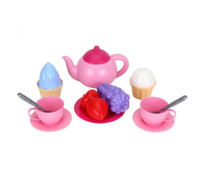 Ігровий набір посудкі буде хорошим подарунком дитині. У комплекті є: чайник з кришкою, 2 чашки з блюдечками і ложечками, 2 форми «кекс з верхівкою», тарілка, виноград, 2 полуниці. Виконаний з якісного пластику.