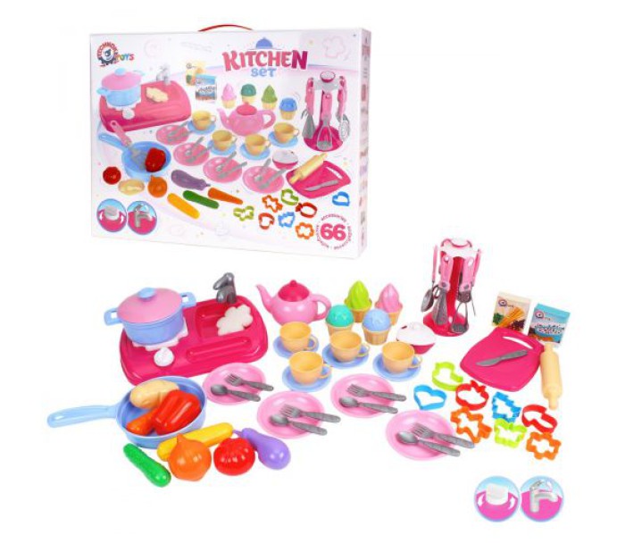 Ігровий набір "Кухня" буде гарним подарунком дитині. У комплекті є: плита, мийка, кухонні прилади - 6 шт., Столові прилади - 9 шт., Тарілочки, чашечки і блюдця - по 4 шт., Каструлька з кришечкою, чайник з кришечкою, сковорідка, овочі 8 шт. (морквина, кукурудза, баклажан, картопля, цибуля, перець, помідор, огірок), 2 коробочки, 4 десерти. Виконано набір з якісного пластику. Для дітей від 3-х років.