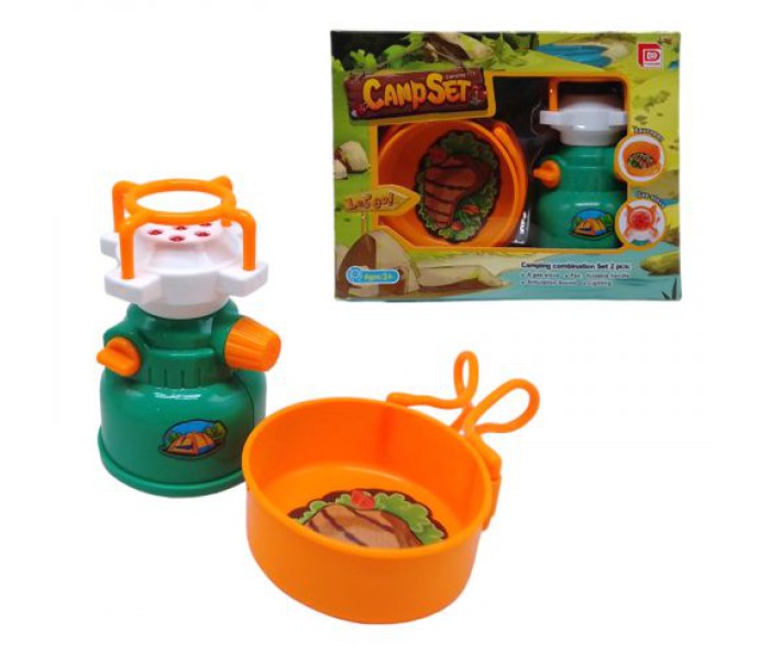 Іграшковий набір "Camp Set: Юний турист" включає газовий пальник і сковорідку. Пальник оснащений світловими ефектами. Повертаючи ручку, можна регулювати висоту "полумʼя". Працює від 2-х батарейок АА (немає в комплекті). Сковорідка із зображенням апетитного стейку.