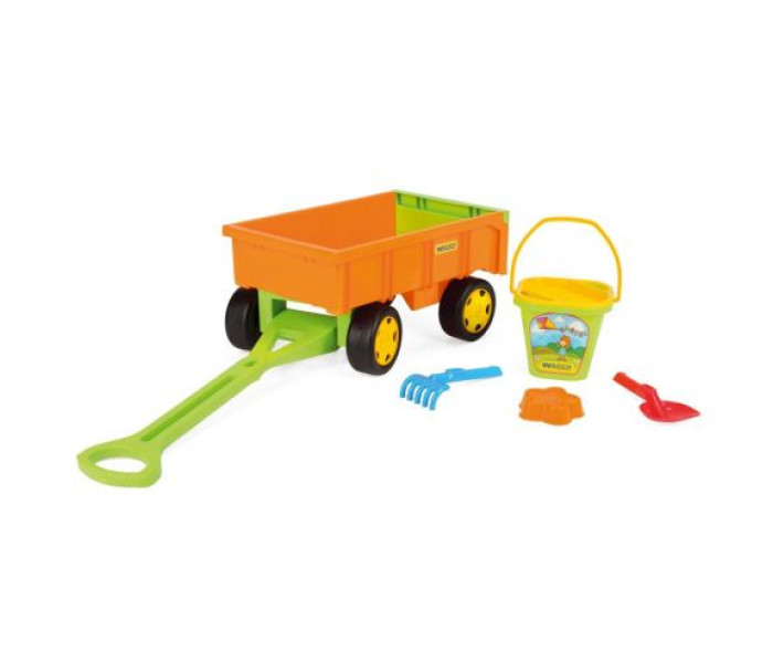 Ігровий набір із причепом-візком призначений для ігор на свіжому повітрі або вдома. Він оснащений зручною ручкою, завдяки якій дитина зможе легко перевозити свої іграшки або насипати пісок. Набір включає все необхідне для гри в пісочниці: відерце, сито, лопатку, граблі та пасочку. Яскраві та міцні аксесуари роблять гру ще цікавішою та сприяють розвитку дрібної моторики та уяви. Цей набір стане чудовим доповненням для будь-якого маленького дослідника і принесе багато радості та веселощів. Розмір причепа без ручки – 48 х 24 х 32 см.