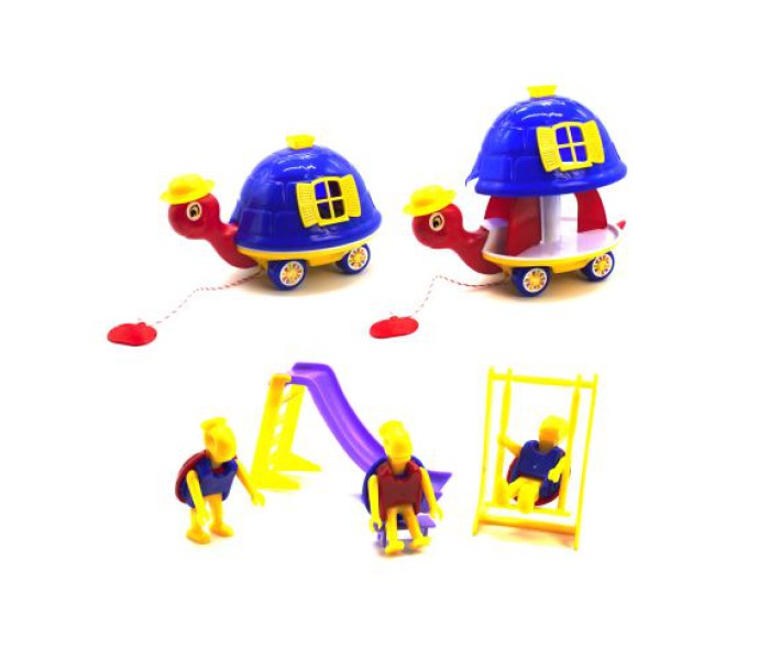 Яскрава каталка у вигляді черепашки, у якої всередині панцира знаходиться будиночок. Якщо натиснути черепашке на хвостик - будиночок підстрибне вгору, і всередині виявиться майданчик з іграшками. У комплекті: 3 фігурки черепашок (7 х 4 см) з рухомими ручками, ніжками і головою, табуретка, гірка і гойдалка. При русі черепаха на колесах хитає головою. Возити каталку можна за зручну мотузочку з ручкою.