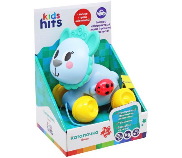 Яскрава кольорова іграшка з тактильними та активними елементами привабить кожну дитину та допоможе розвинути моторику та сенсорику під час гри. Інерційні колеса, під час руху обертає головою. На боці у іграшки є приємна тріскачка. Колеса прогумовані.