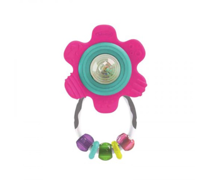 Пелюстки квітки виготовлені з мʼякого текстурованого матеріалу і ідеально підходять для масажу ясен під час прорізування зубів. Іграшка-брязкальце має всередині намистини, які гримлять. Ручка іграшки виконана з намистин різного кольору.