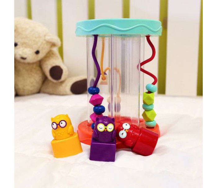 Три фігурки-сови повільно опускаються уздовж відповідного отвору-сортера з м'яким кумедним звуком, схожим на совине «УГУУУУУУУУУ».