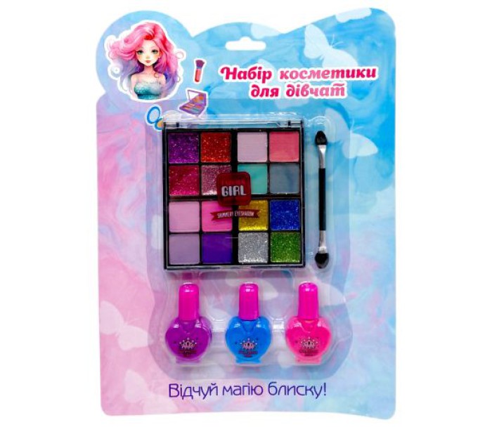 Набір косметики "Fashion girl" буде гарним подарунком для юної леді. У наборі є палетка тіней (16 кольорів. 8 - з великими блискітками, 8 - з дрібними), апликатор для тіней, 3 лаку для нігтів. Виконаний з якісних і безпечних матеріалів. Для дітей від 3-х років.
