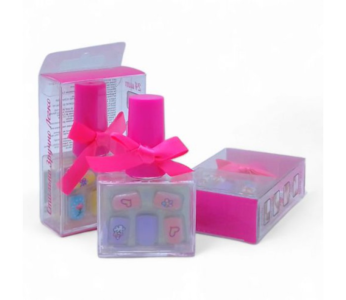 Дитячі накладні нігті у стильній упаковці, виконаній у вигляді флакона лаку для нігтів. У комплект входять 2 набори (24 штуки, включаючи запасні). Яскраві та безпечні для дітей, ідеальні для веселих ігор та створення яскравого образу. Різні види асортиментів.